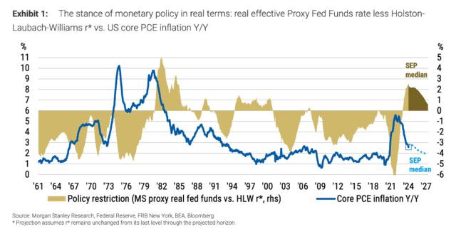 研报认为,目前的货币政策看起来在实际利率方面大约只有1980年代沃尔克时期紧缩程度的一半,但通胀率只有1980年代的三分之一(当时约为9%,现在约为3%)。仅此一点,就应该让投资者对美联储过于紧缩的货币政策感到担忧。